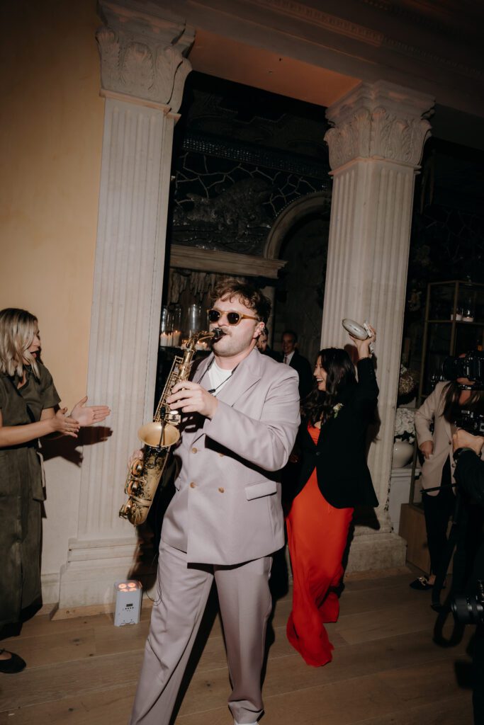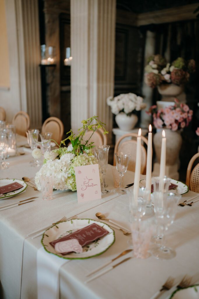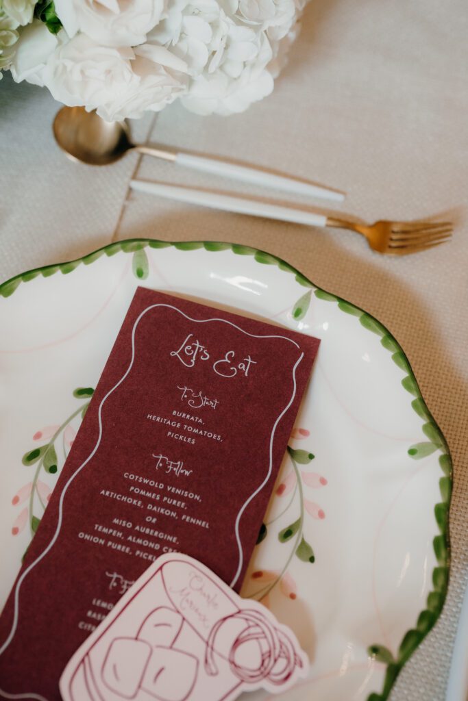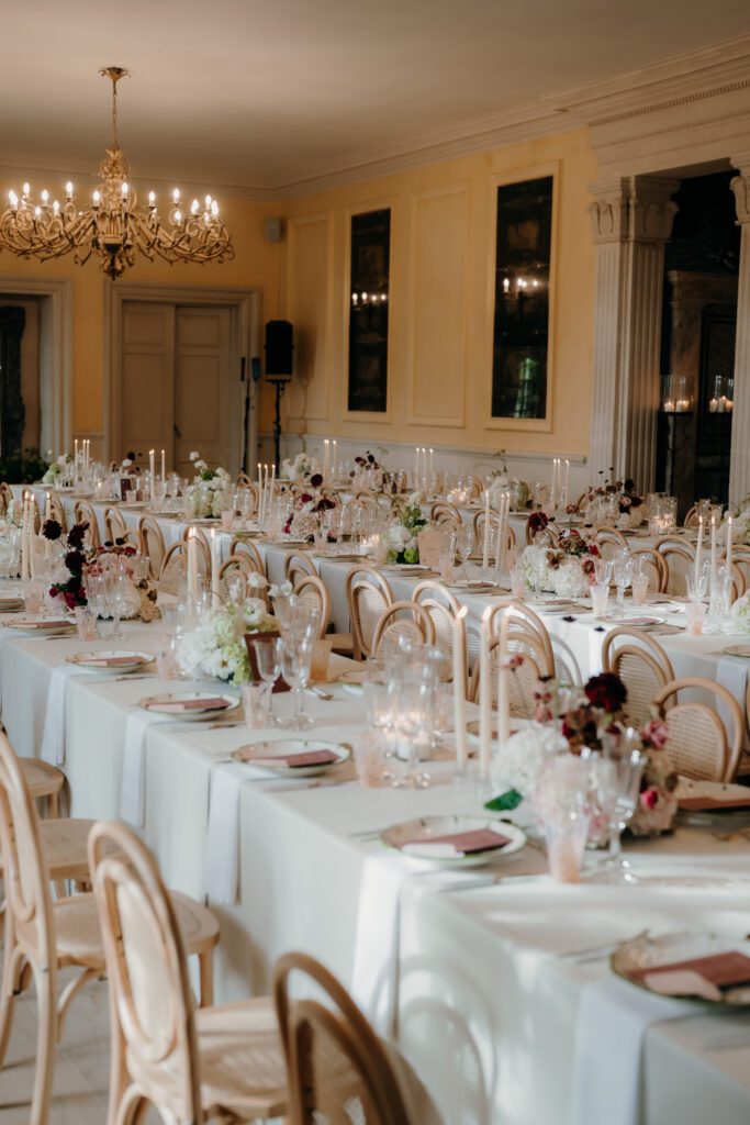 Florals by Clementine Moon Floral Design brought softness and movement, perfectly complementing the curated and modern take on a Chuppah. This followed through to the drinks reception in the orangery with cocktail stations and curated seating. However the star of the show was the dining room, from refined tableware by The Luxe Collection UK to the layered textures and considered details throughout, every element worked in harmony.